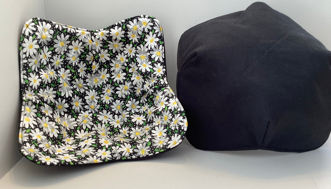Cotton fabric with polyester inner lining. Reversible, Bowl Warmer Cozy measuring 9 inches from opposite corner to corner and 3.5 inches inner depth. Turned upside down, bottom measures 5.5 inches. Do not microwave longer than 3-4 minutes for safety.