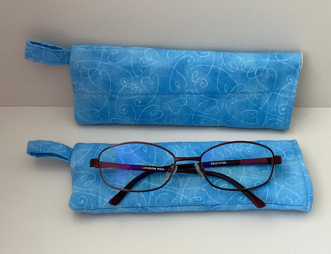Quilted, Eye Glass Case measuring 2.5 inches by 7 inches with a tab and velcro at the opening.